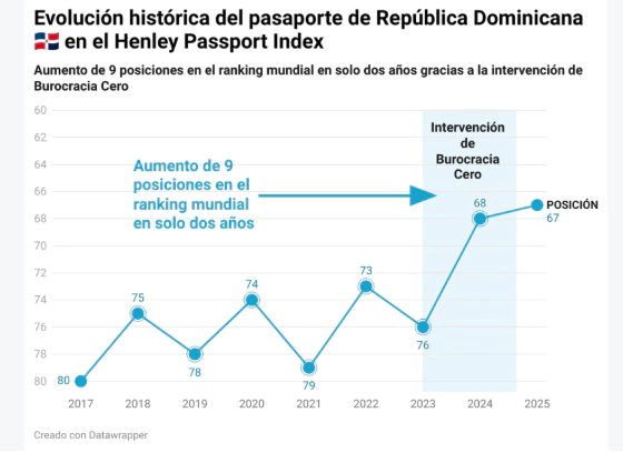 El Gobierno dominicano celebró este lunes la mejora significativa del pasaporte dominicano en el Índice Henley 2025, que evalúa la libertad de viaje de los ciudadanos a nivel global. La República Dominicana avanzó nueve posiciones, alcanzando el puesto 67, con acceso sin visa o con visa a la llegada a 70 destinos internacionales.