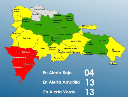 Actualmente, 19 provincias permanecen en alerta meteorológica. Entre ellas, Duarte, Santiago, Independencia, La Vega, Monte Plata y Espaillat. Además, siete provincias están bajo aviso: Santo Domingo, San José de Ocoa, San Cristóbal, Pedernales, Barahona, Peravia y Azua.