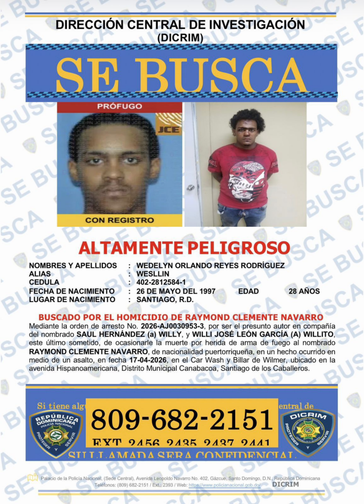 Los buscados fueron identificados como Saúl Hernández, alias “Wily”, y Wedelyn Orlando Reyes Rodríguez, conocido como “Wesllin”, ambos de 28 años y residentes en Santiago, quienes son perseguidos por su presunta participación en el hecho.