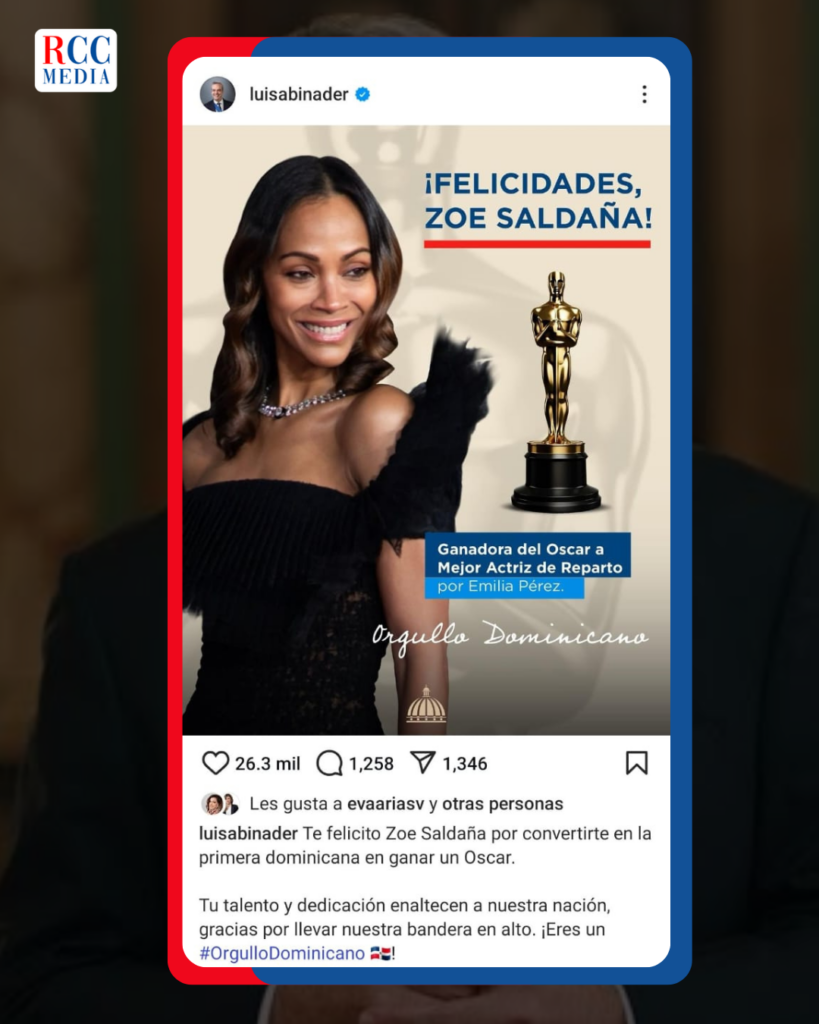 El presidente Luis Abinader felicitó a Zoé Saldaña hoy por ser la primera actriz dominicana en ganar un Óscar, la actriz ganó el premio a Mejor Actriz de Reparto por su interpretación de la abogada Rita Moreno en la película Emilia Pérez.