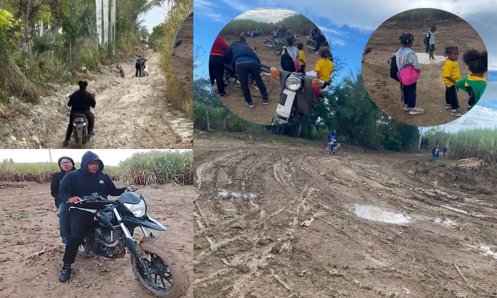 Profesores denunciaron que deben trasladarse junto a sus estudiantes entre fango, lodo, acumulación de agua y cañaverales para llegar a la escuela Mata de Palma, debido al deterioro de la carretera que conduce al centro educativo.