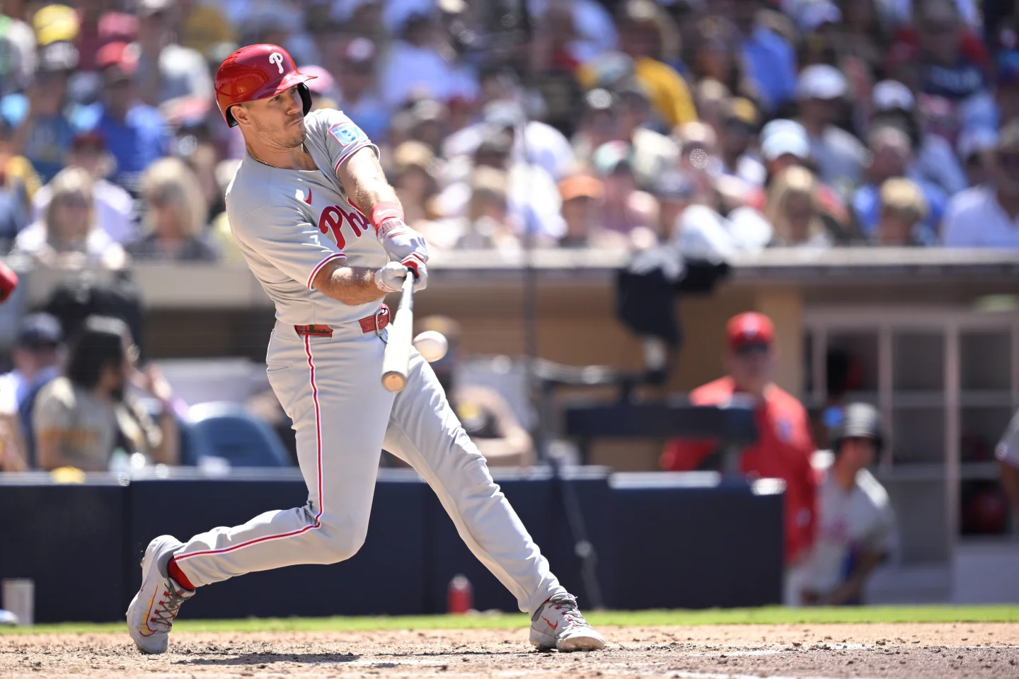 Con los Padres cediendo la mayor parte del lado izquierdo del infield y el relevista zurdo All-Star Adrian Morejon (7-4) lanzando, el zurdo Harper envió un fuerte disparo a unos pocos pies dentro de la línea de tercera base que rodó hacia el jardín izquierdo. David Morgan entró y ponchó a Nick Castellanos antes de que Realmuto conectara un doblete en la brecha entre el jardín izquierdo y el central para traer a Harper. Morgan gritó dentro de su guante en frustración.