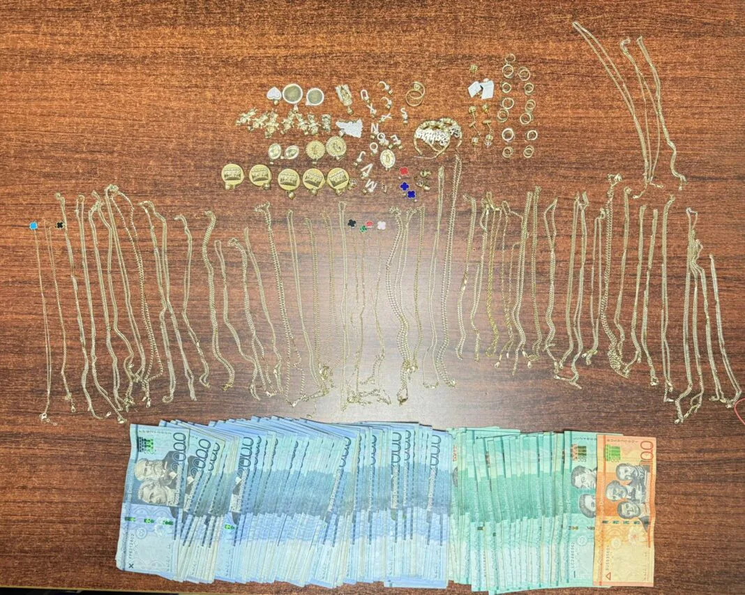 Durante la intervención, las autoridades incautaron en su vivienda varias prendas que se presumen de oro —incluyendo cadenas, anillos, medallas y aretes— con un peso cercano a 292 gramos, así como RD$214,600 en efectivo.