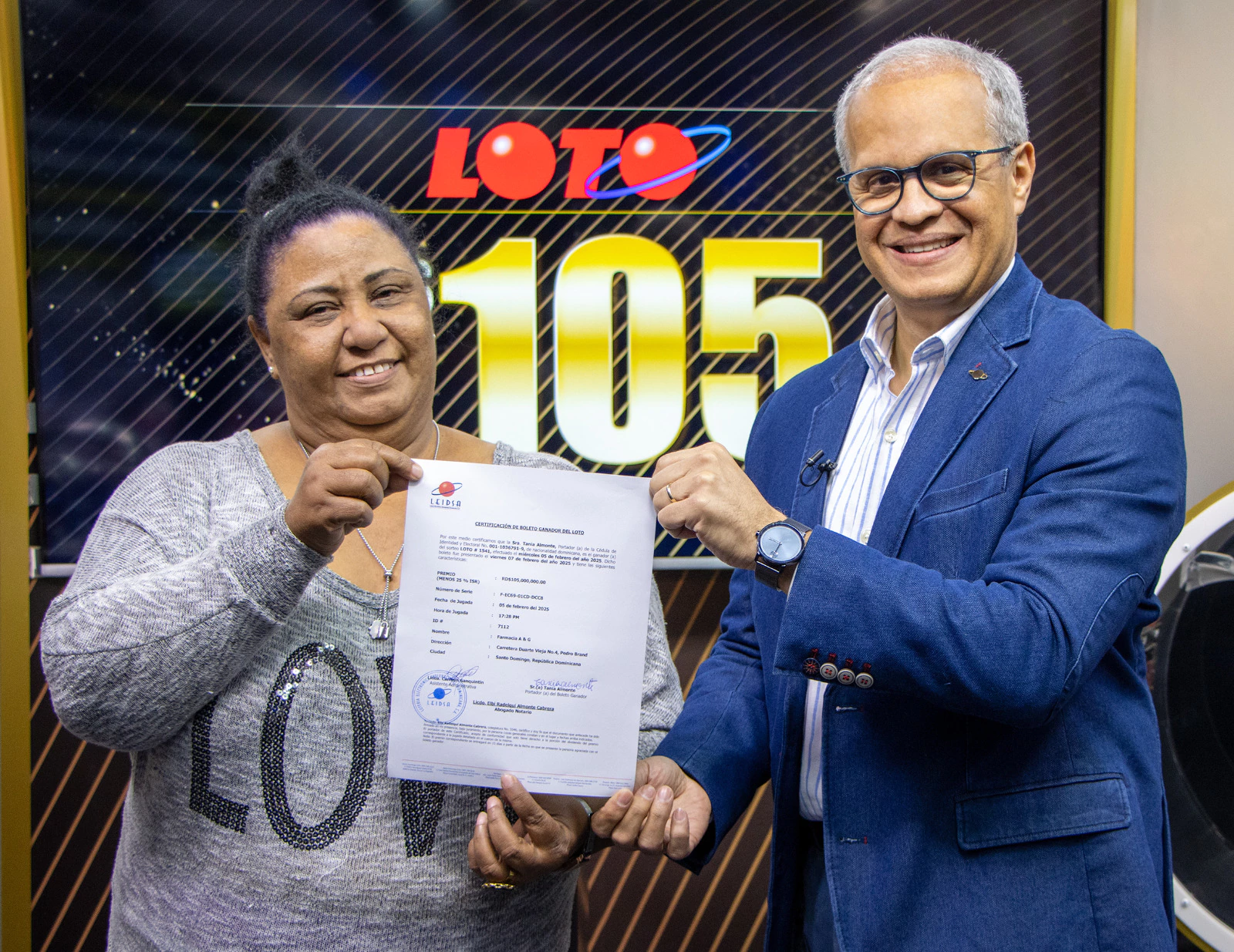 La Lotería Electrónica Internacional Dominicana (LEIDSA) informó que Tania Almonte, quien presentó el ticket ganador, recibió su certificado como ganadora de los 105 millones de pesos del sorteo Loto realizado el 5 de febrero.