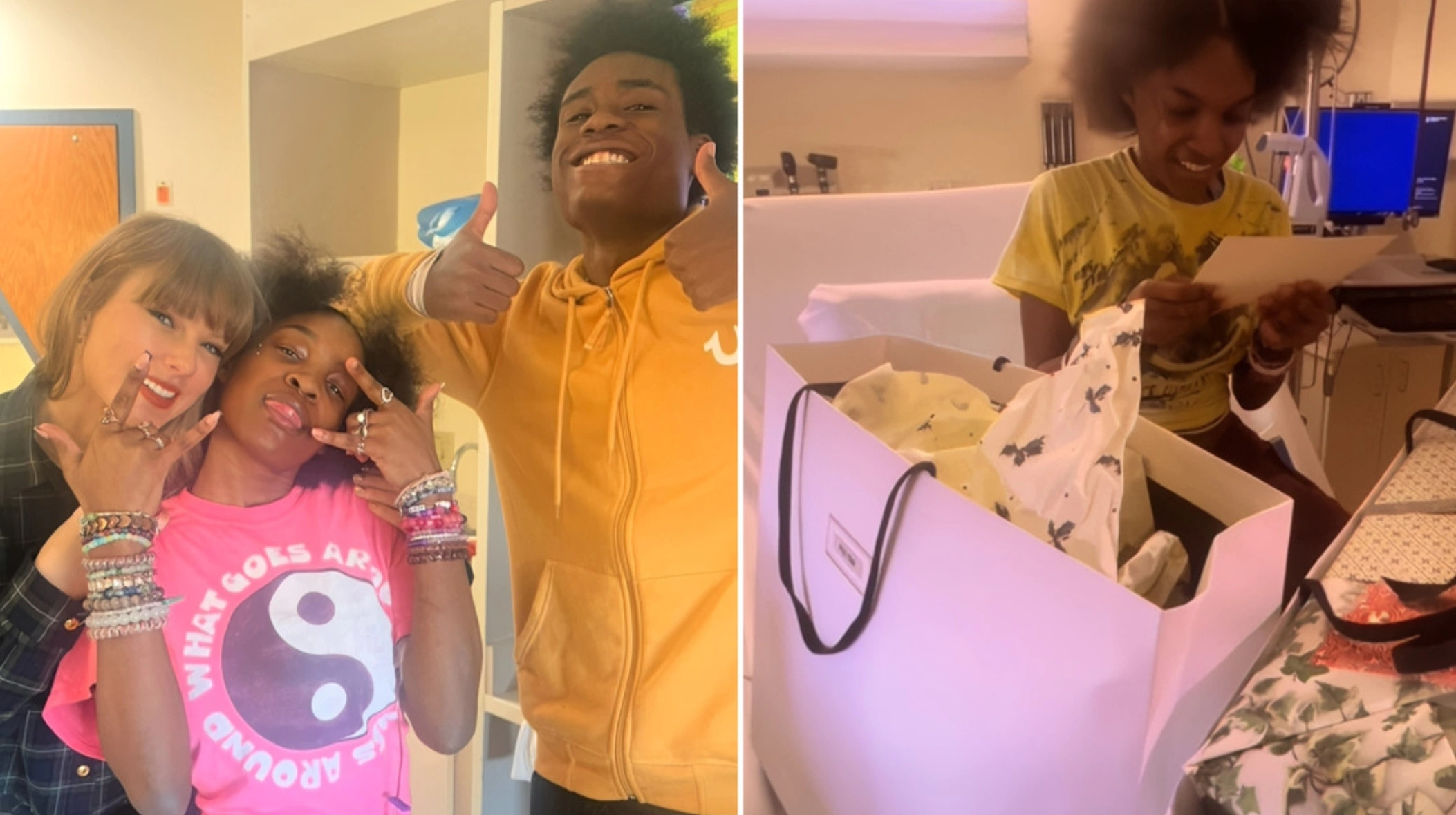 El 12 de diciembre, durante una visita al Children’s Mercy Hospital, la estrella del pop conoció, entre otros, a una paciente de 19 años llamada Naya, que compartió un video del encuentro con su ídolo y que se hizo viral en las redes sociales. El domingo, la joven publicó otro video en el que se la ve desenvolviendo el regalo que Taylor le había enviado.
