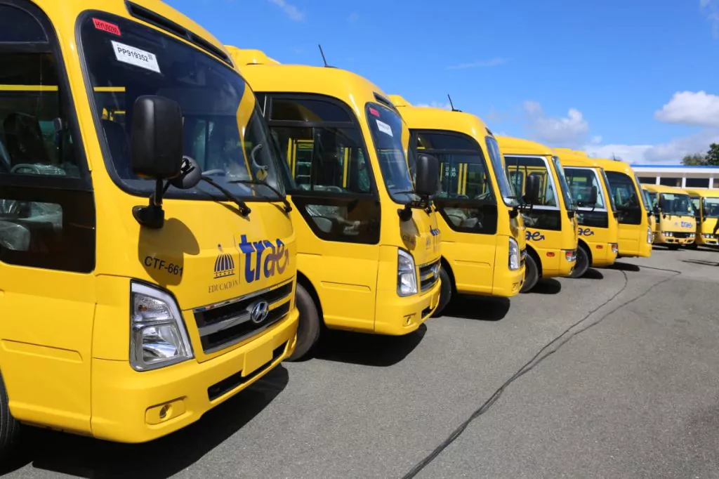 Se espera que a mayo 2024, TRAE esté operando en todo el territorio nacional, con 956 autobuses rentados y 814 adquiridos por el Ministerio de Educación (Minerd), incluidos 300 autobuses eléctricos, que permitirán mitigar la huella de carbono del cambio climático.