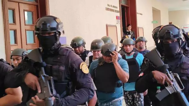 Momento en que son trasladados los imputados a la sala de audiencia donde se llevará a cabo el inicio del conocimiento de la solicitud de medida de coerción contra los agentes de la Policía Nacional implicados en la Operación Pandora.