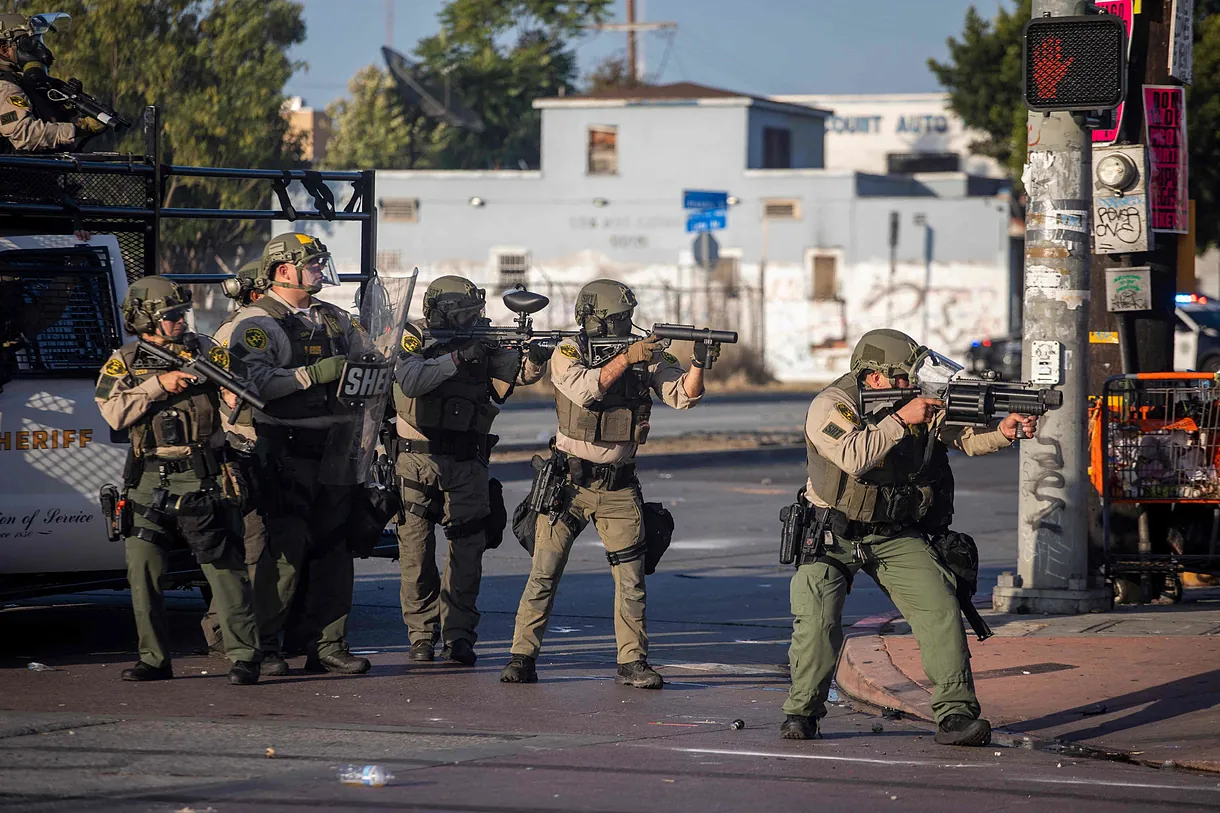Los alguaciles del condado de Los Ángeles dispararon granadas aturdidoras y gases lacrimógenos cada pocos minutos para dispersar a los manifestantes.